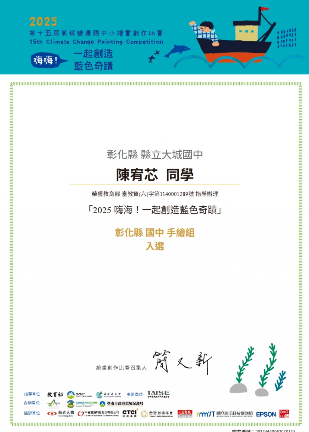 201陳宥芯同學 榮獲 「2025 嗨海!一起創造藍色奇蹟」彰化縣 國中 手繪組 入選